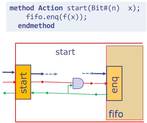 其次,是控制信号之间依赖关系的差异。在BSV中,method的en信号依赖于rdy信号,具体来说一个method只有在其准备好(rdy为高)时才能被调用。下图展示了这一依赖关系在硬件上的具体实现,即输入的en信号需要和输出的rdy信号相与后传递给下一级。而在AXI协议中,为了避免产生死锁(通信双方都等待对方准备好后再响应),其明确规定:master输出的valid信号不能依赖于ready信号,即不能等待slave侧准备好后再发起请求;相反,slave端输出的ready信号可以依赖于输入的valid,即可以等待master发起请求后再作响应。