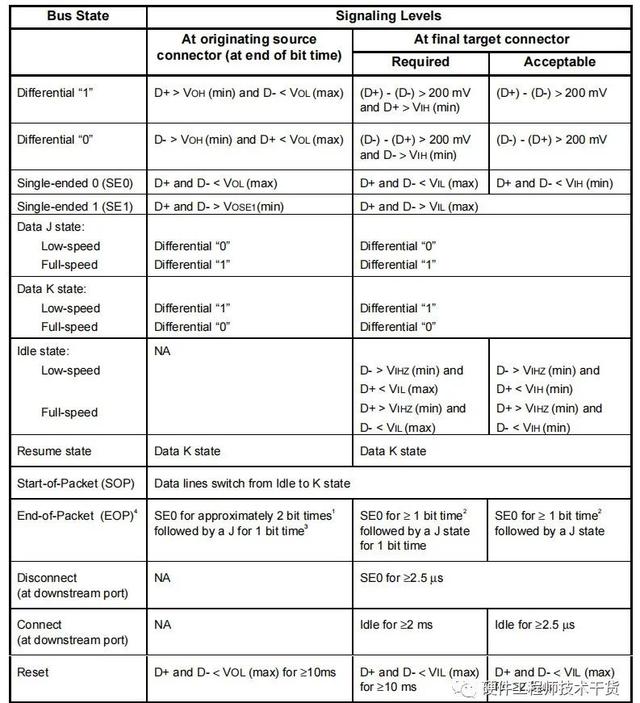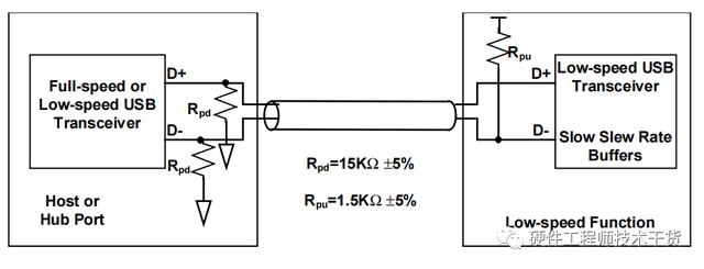 低速设备上拉电阻在D-上,主机通过监听两个数据线的状态识别不同类型的设备,上拉电压源3.0-3.6V,如下图: