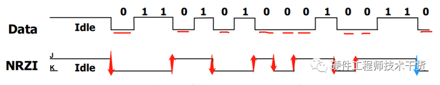 USB采用NRZI编码,NRZI编码格式原理是:翻转为0,保持为1,如下图: