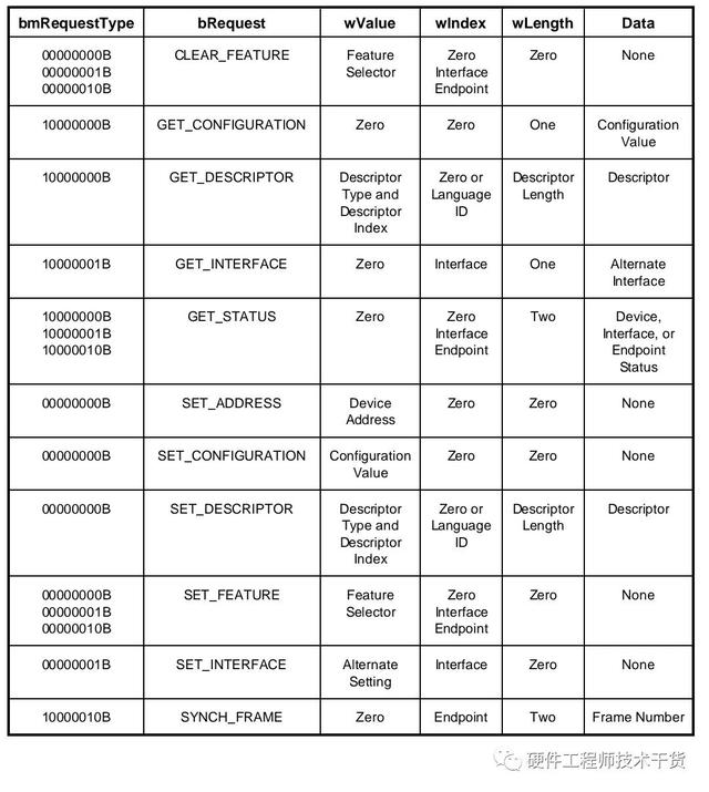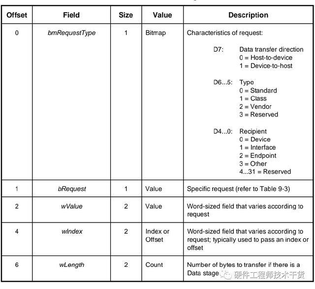 USB标准请求通过SETUP事务下发到设备端,请求出现在SETUP事务的DATA0数据包中,注意此处必须是DATA0,共有8个字节。标准请求是为了获取或者设置设备参数,比如获取描述符,设置地址,设置配置等。以下是SETUP数据包格式