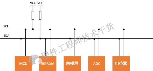 IIC(Inter-Integrated Circuit)是一个多主从的串行总线,又叫I2C,是由飞利浦公司发明的通讯总线,属于半双工同步传输类型总线。IIC总线是非常常见的数据总线,仅仅使用两条线就能完成多机通讯,一条SCL时钟线,另外一条双向数据线SDA。如下图所示,其中两个上拉电阻是必需的。