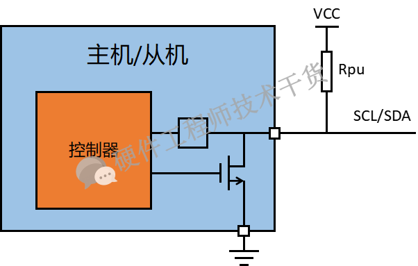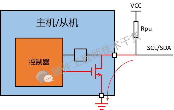IIC总线上有两种状态,一种是MOS管导通总线被拉低,另外一种是MOS关断总线被上拉电阻拉高,如下图所示: