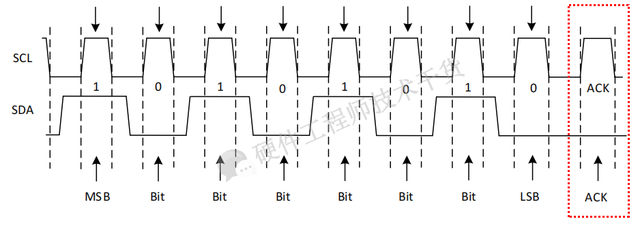 ACK: SCL高电平时,SDA为低电平,表示数据被正确接收,发送方可以继续发送,如下图所示: