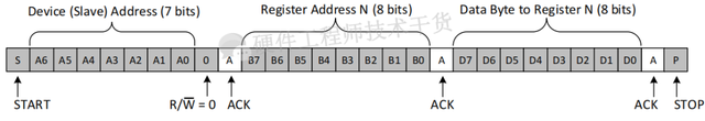 主机首先发送START信号占用总线,然后发送7Bit从机地址,一般情况下从机地址是通过外部上下拉电阻分配的,7Bit从机地址之后是读写位,如果主机想要写数据此位为0,读数据此位为1,之后紧随从机ACK,然后主机发送寄存器地址,即数据写在从机哪个地址上,从机再次返回ACK,主机继续发送数据,所有数据发完之后,主机发送STOP后释放总线。