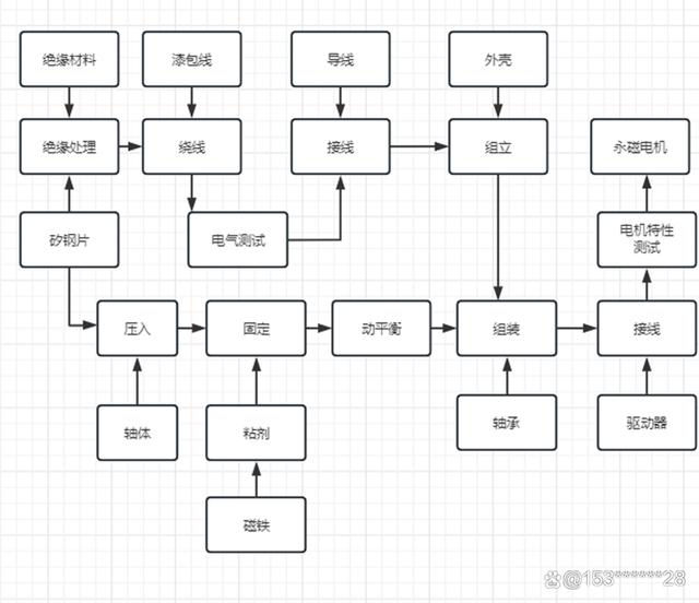 首先,我们来看一下永磁电机的生产过程图,其中上部代表所使用的材料,中间部分表示生产过程,下部部分为检测程序。