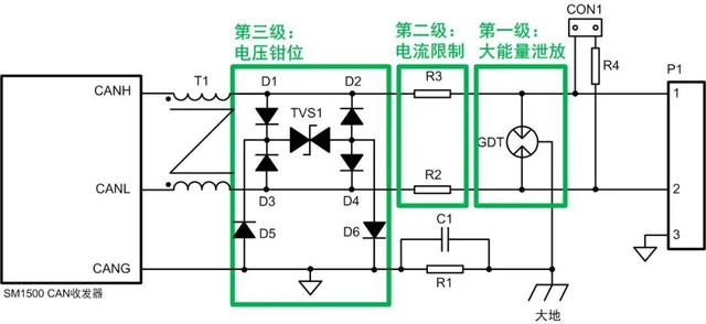 图1为CAN接口推荐保护电路,合理的保护可以极大提升接口的抗干扰能力。总线接口保护分三级,一级实现大能量泄放、二级进行电流限制、三级进行电压钳位。各级电路各司其职,共同作用达到最佳的保护效果。