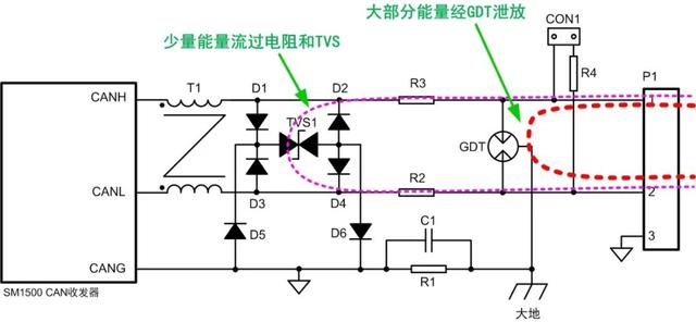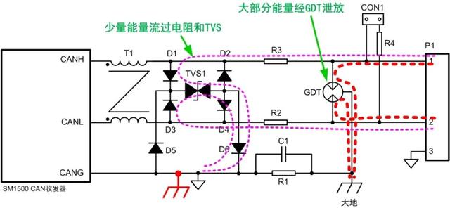 如图3,为保证良好的保护效果,通信参考地CANG应在组网后单点接地。 当有共模干扰电压施加在接口1,2脚时,TVS1响应最快,首先导通,芯片总线引脚与CANG之间的电压被钳位。R2、R3电阻限制流过TVS1的电流,防止其过功率损坏。GDT响应最慢,最后导通,泄放掉大部分能量,并将残压限制在较低水平。