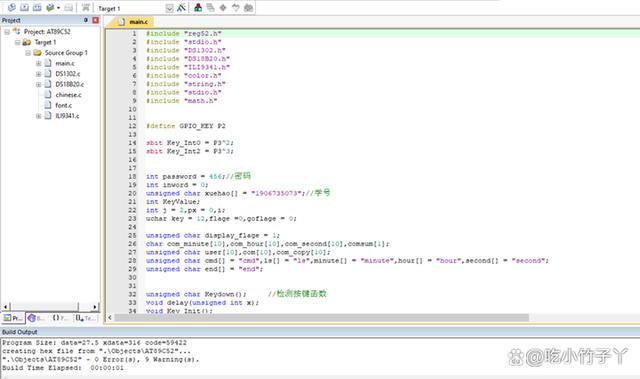 彩色液晶屏显示用户输入密码界面,通过矩阵键盘进行密码输入,DS1302与DS18B20进行时钟与温度的采集,在彩色LCD上显示。按键KEY1进入中断进行时钟的调节,时钟调节通过串口命令进行调节。
