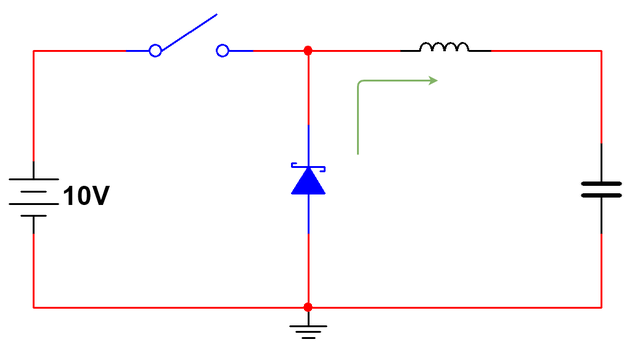 但是上面这个电路有个问题。假设开关已闭合,我们的电源正在输送一些电流。这意味着电流正流过这个电感器。