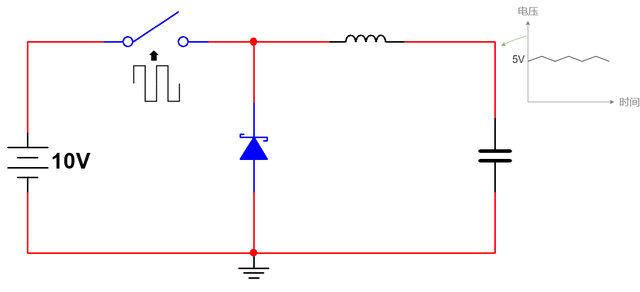 出于效率原因,开关应该使用场效应(MOS)管。但现在我们在电路中还是用通用开关符号。接下来让我们用占空比为 50% 的脉冲宽度调制(PWM)信号来控制开关的断开和闭合。