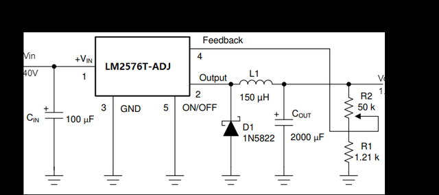 输入可以在 40 伏的范围内。不要施加更高的电压,否则可能会烧毁 LM2576T-ADJ 组件。在这种情况下,我们不需要外部开关,因为 LM2576T-ADJ 里面已经有了。将电压反馈引脚连接到输出分压器后,LM2576T-ADJ 将根据输出电压的高低改变输出控制方波的占空比以保持输出电压恒定。在这种情况下,使用肖特基二极管,因为它具有低正向压降电压。