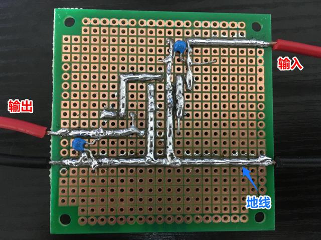电路板底部的布局比顶部更重要。注意我的地线是一条直线,那两个蓝色的是 100 nF 滤波电容,输入输出各一个:
