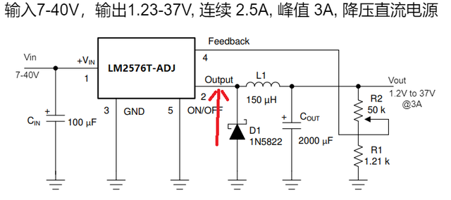 上面的降压型开关电源,罗里吧嗦,又是方波,又是反馈,挺麻烦的。市面上有多种降压型开关电源芯片,提供一站式解决方案。。比如 LM2576T-ADJ 这款芯片,使用反馈电阻可以在负载变化的情况下,保证输出电压不变。