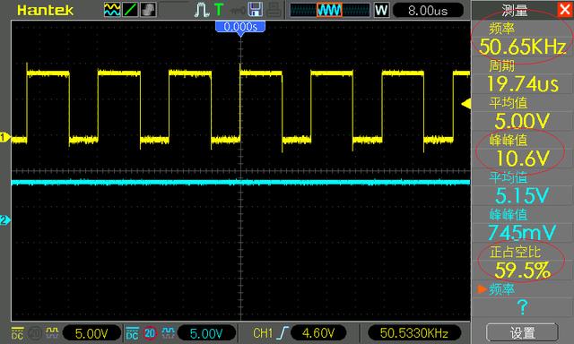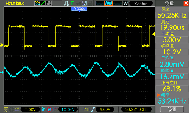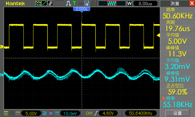您可以看到我们熟悉的 0 到 10伏方波,开关频率为 50.65 kHz。但是你可以看到占空比为 59.5 %,而不是理论上的 50%,此时的负载电流为 1 安培。