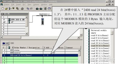 进一步设定 MODBUS 参数:双击 2#槽中的“24 DI read 24 bits(0xxxx) 1..3”;选择“Parameter Assigement”,完成“从站地址”和“起始地址”的参数设定,