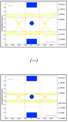 步骤3允许您估计长数据序列中接收信号的抖动质量。许多抖动应用包都包括标准模板,其最小闭合尺寸允许您评估测量通道的质量。通过将眼图与接收掩码进行比较,您可以查看给定配置中的眼闭量。眼睛应该没有面罩(图9a和9b)。