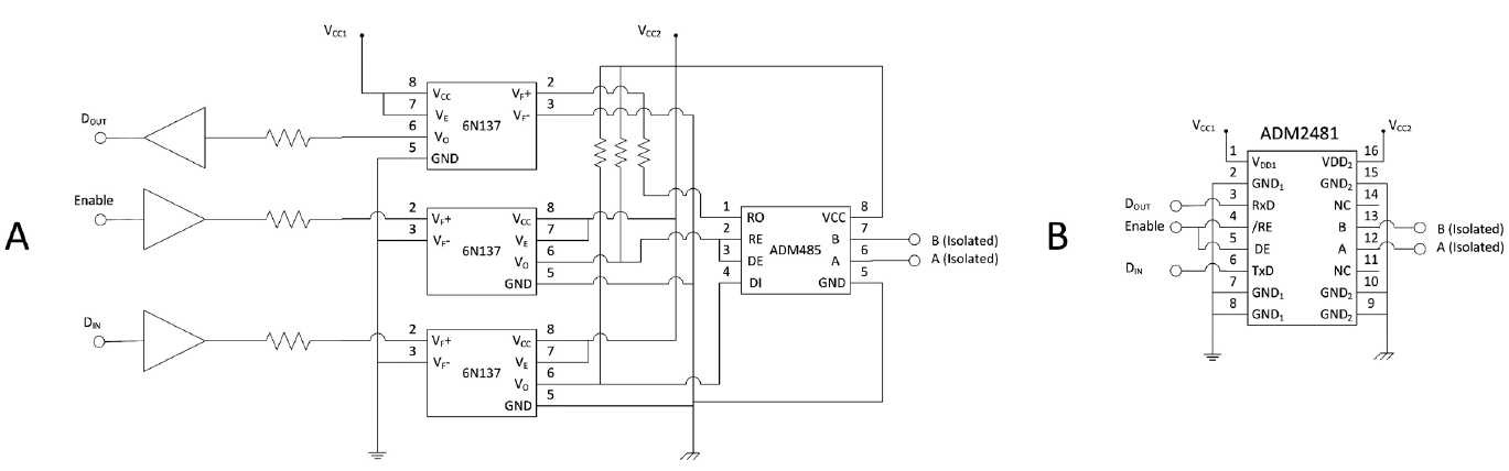 图1显示了隔离的不同方法I2C总线。图 1A 显示了如何使用 I 执行此操作2C缓冲器和四个光耦合器。图1B显示了如何使用单个IC执行此操作。图2显示了隔离RS-485的类似示例,单IC方法显然是采购经理的梦想:一个部件比两个部件便宜。我们甚至不会展示尝试使用分立元件隔离 USB 与单个隔离 USB IC 之间的戏剧性比较 — 页面上没有足够的空间!