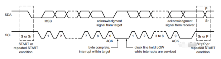 4)数据采集时刻:I2C通信的数据在SCL的上升沿进行采集确认,所以在SCL的高电平期间,数据必须保持不变,防止数据采集出错。当然,START信号和STOP信号的时序在SCL高电平期间是特殊情况,具有专门的含义。