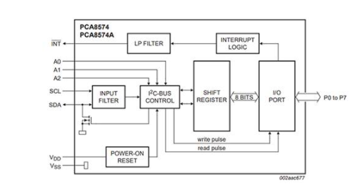 图 2:NXP 的 PCA8574 是一款准双向 8 位 I/O I2C 扩展器。该扩展器只有一个 I2C 寄存器可供读写,从而在其引脚上执行 I/O 功能,因此是一款非常简单、精巧的器件。(图片来源:NXP Semiconductors)