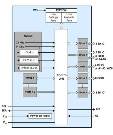 图 5:Cypress Semiconductor 的 CY8C9520 是一款配有 EEPROM 的 20 位、40 位或 60 位 I/O 扩展器。该扩展器允许将扩展引脚配置为输入、输出或 PWM。(图片来源:Cypress Semiconductor)