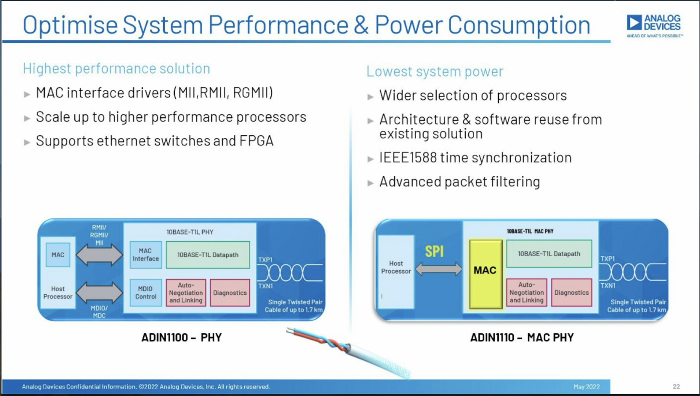 ADI提供ADIN1100和ADIN1110这两大10BASE-T1L PHY和MAC PHY产品,后者集成了MAC,更适合对于MCU资源要求低的应用中,比如传感器。而对于需要打造环形网络拓扑的客户,ADI也提供了双端口的ADIN2111。