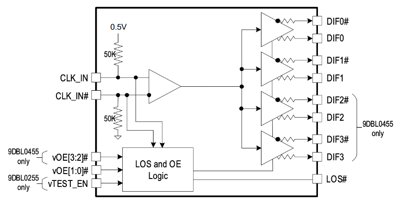 信号丢失(LOS)输出电路,用于指示是否存在输入时钟。瑞萨也有内置PLL的PCIe缓冲器,不过在需要扩频的情况下,基本都要用到纯扇出缓冲器。而且在没有旁路mux的情况下,也进一步降低了传播延迟。