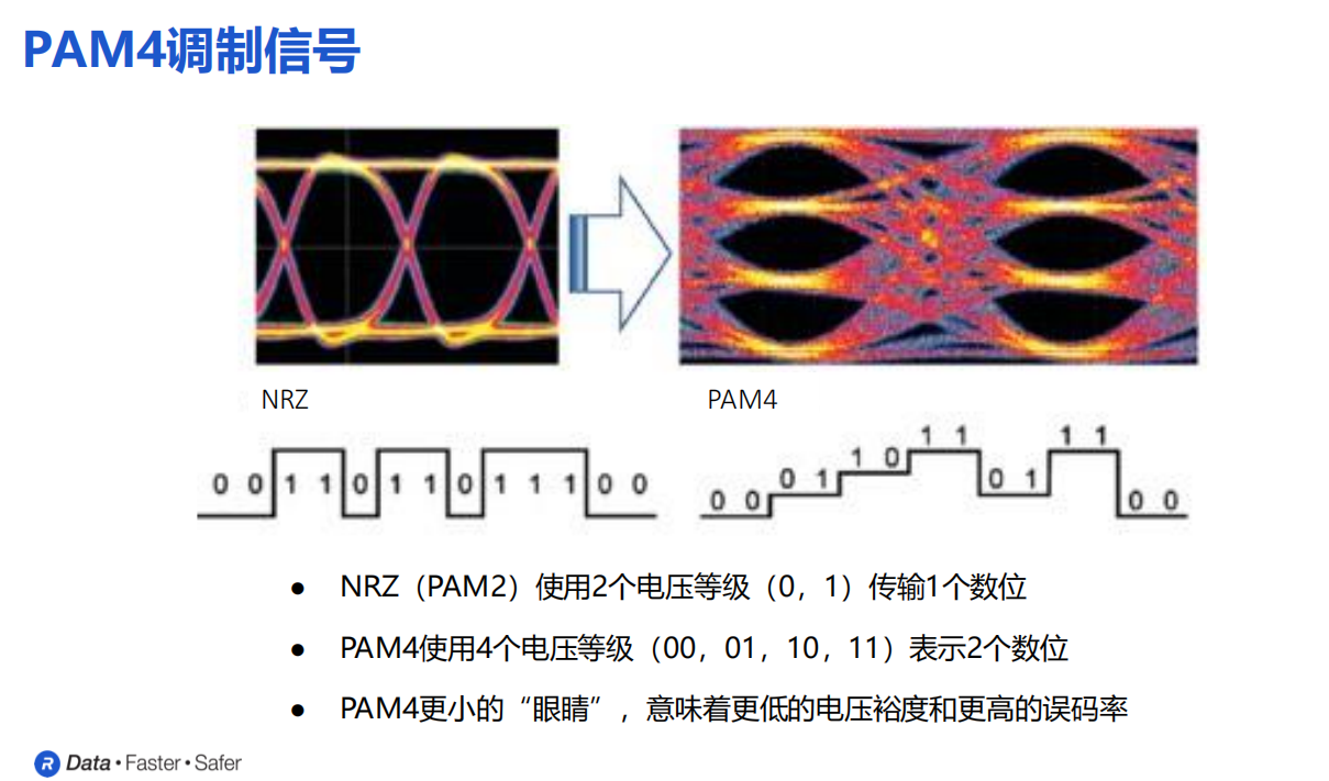 为了更好地在PCIe技术规范之下实现64GT/s的数据传输速率,并克服整个通道传输长度以及距离的限制,新规范采用了全新的PAM4调制信号,也就是四电平脉冲幅度调制。