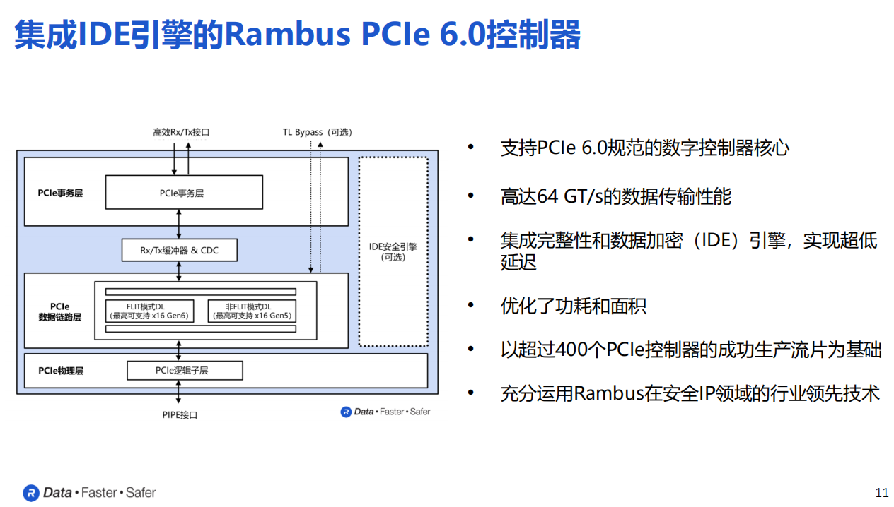 Rambus的PCIe 6.0控制器不仅数据传输速率高达64GT/s,更重要的一点是,该控制器还集成了完整性和数据加密(IDE)引擎,可以实现数据在不同PCIe设备的PCIe通路之间的安全传输。
