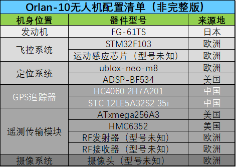 那么,我们就能大致得到一份Orlan-10无人机的配置表和相应的零部件来源。