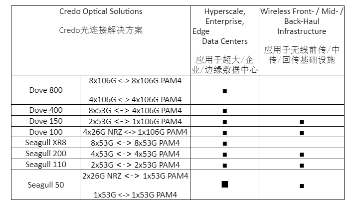 来访者将可在Credo VIP展区内看到由Credo相关专家带来的应用于数据中心和无线基础设施的Credo光DSP系列产品的展示,展出的创新产品包括: