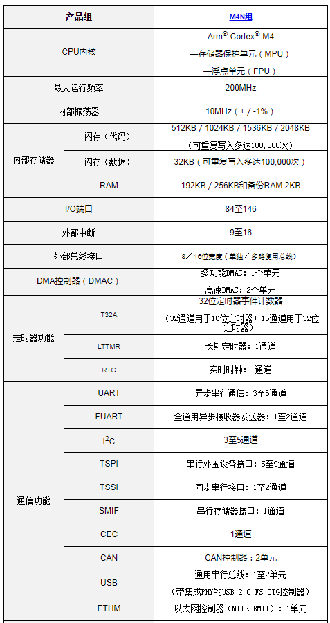 新款M4N组产品用串行存储器接口强化通信功能,除UART、FUART、TSPI和I2C外,还支持Quad/Octal SPI、音频接口(I2S)以及外部总线接口。此外,这些器件能够为各个外围电路分配独立DMA与RAM,而且由于采用了总线矩阵电路配置,可确保通过总线主控器实现高效的数据传输。因此,M4N组器件可同时支持以太网控制器、CAN与USB控制器的独立并行处理。