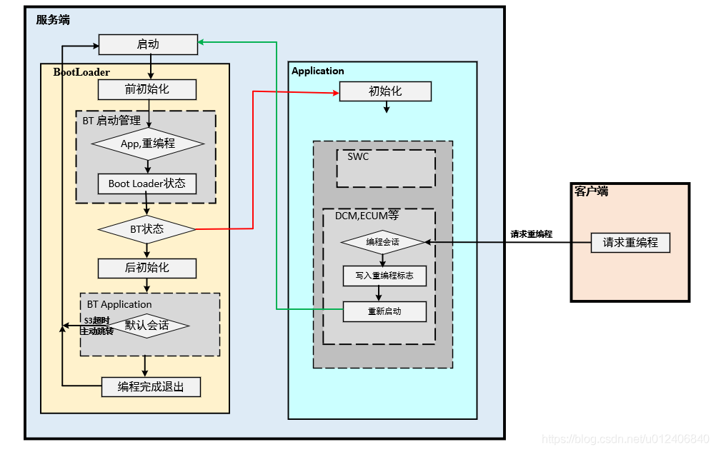 Bootloader是所有支持重编程的ECU必须具备的软件功能,在ECU运行过程中,执行的是应用软件和应用数据,仅当应用软件或应用数据无效时,或者要求对其进行升级或特殊测试时,Bootloader软件才被激活。启动过程如下图所示: