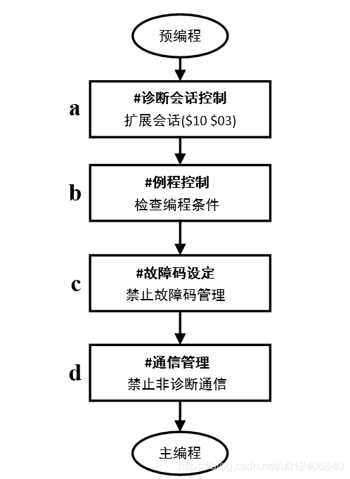 2)、预编程条件——ECU确保编程时处于安全状态,条件不满足(如高压上电或车辆运行)时,编程服务请求将被拒绝。
