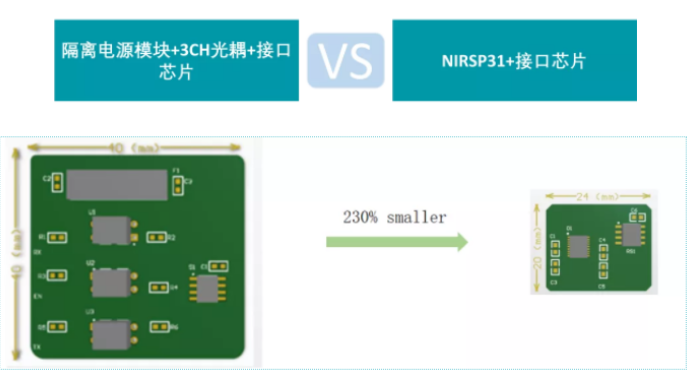 对比接口隔离方案中常用的隔离电源模块+光耦+CAN/485收发器方案,可以看出,右侧采用全新集成隔离电源的三通道数字隔离芯片NIRSP31+接口芯片大大减少了PCB面积以及外围器件数量,降低了整体方案成本的同时也带来了更优的性能体验。