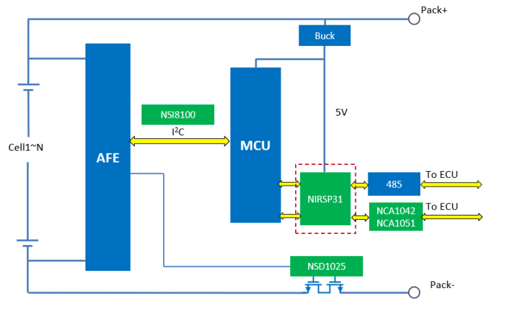 除NIRSP31外,双向I2C隔离器NSI8100,双低边驱动NSD1025,通用CAN收发器NCA1042/NCA1051芯片均适用于工业BMS应用,均已量产,如有需求可电话0512-62601802咨询。