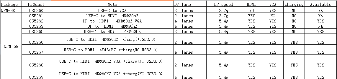 四颗芯片均集成USB Type-CPowerDelivery2.0协议控制器,双通路Command Channel通讯编码电路模块和USB Billboard class。CS5268还集成了HDMI 2.0Tx以及HDCP1.4/2.2模块,单芯片支持USB Type-C Display Port转HDMI+VGA的所有功能。CS5269单芯片支持USB Type-C Display Port转HDMI2.0+VGA带PD3.0快充的所有功能。