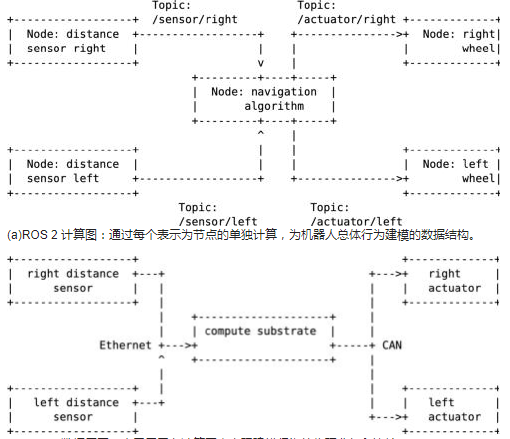 ROS 不仅提供工具、库和惯例,而且还拥有不断扩大的机器人专家社区。从概念上讲,ROS 在大多数方面围绕着被称为 ROS 计算图的抽象。计算图内的每个节点都能开展机器人计算,并通过用底层通信中间件实现的通用点对点数据总线与其他节点交换信息。数据总线内的通信通道按话题组织。因此,机器人的总体行为取决于计算图,而计算图可以实现在一部或多部计算机上(以分布方式)。这就完成了第二次抽象,也就是将计算图映射到机器人中可用的计算基干形成 ROS 数据层图。数据层图代表的是物理分组和连接,用于在计算图中实现建模行为。简单地说,其捕获的是机器人的物理现实,包括通信总线、机器人组件(包括传感器和/或致动器),以及计算图与现有机器人组件中可用的计算基干间的映射。
