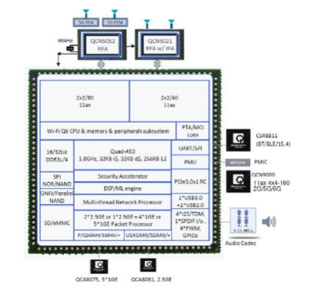 IPQ6018是业界先进的WLAN芯片厂商Qualcomm推出的新一代IPQ6000系列WiFi接入点/无线路由器解决方案,由WiFi子系统、网络处理子系统及CPU子系统组成,可支持WiFi 5规范。IPQ6018不同于上一代的IPQ4018、IPQ4019等802.11ac Wave2方案,IPQ6018并没有集成WiFi的射频部分,而是采用了射频与基带分离的方式,可降低芯片的发热量。