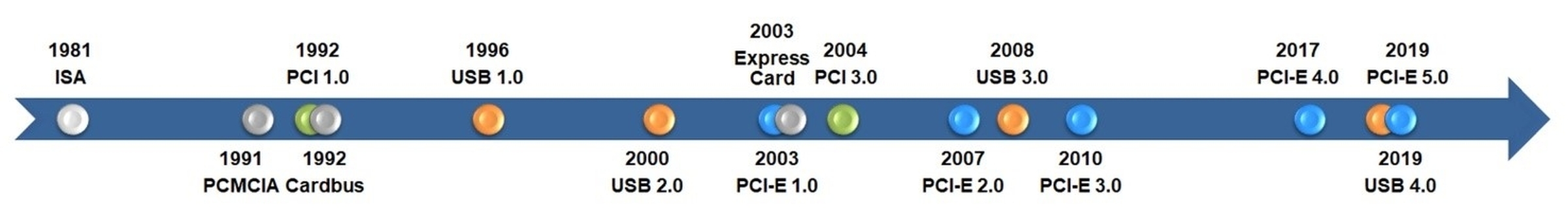 随着计算机科技的进步,计算机周边接口汇流排技术也日新月异,从1981年IBM PC发布8位ISA汇流排技术,最大传输速度为8 MB/s;1992年进化到32位PCI汇流排技术,最大传输速度为132 MB/s;2003年计算机汇流排技术,演进到通信接口更简单、传输速度更快的PCI Express 1.0串列汇流排技术(简称PCI-E或PCIe),可支持X1/X4/X8/X16传输通道,X16通道双工最大传输速度可达8 GB/s;2019年推出最新的PCI Express 5.0汇流排技术标准,X16通道双工最大传输速度更可达63 GB/s。一般PCI 32位汇流排技术,最大传输速度为132 MB/s,通信接口需要124引脚;最新的PCIe 5.0串列汇流排技术,X1通道双工最大传输速度为3938 MB/s,通信接口只需要36引脚;X16通道通信接口也只需要164引脚。在计算机科技追求轻薄短小、高传输频宽的大趋势下,PCIe计算机周边产品逐渐取代PCI周边产品已经是必然发生的事实。计算机汇流排技术的大跃进,俨然成为各种计算机周边设备技术进步的坚强基石。