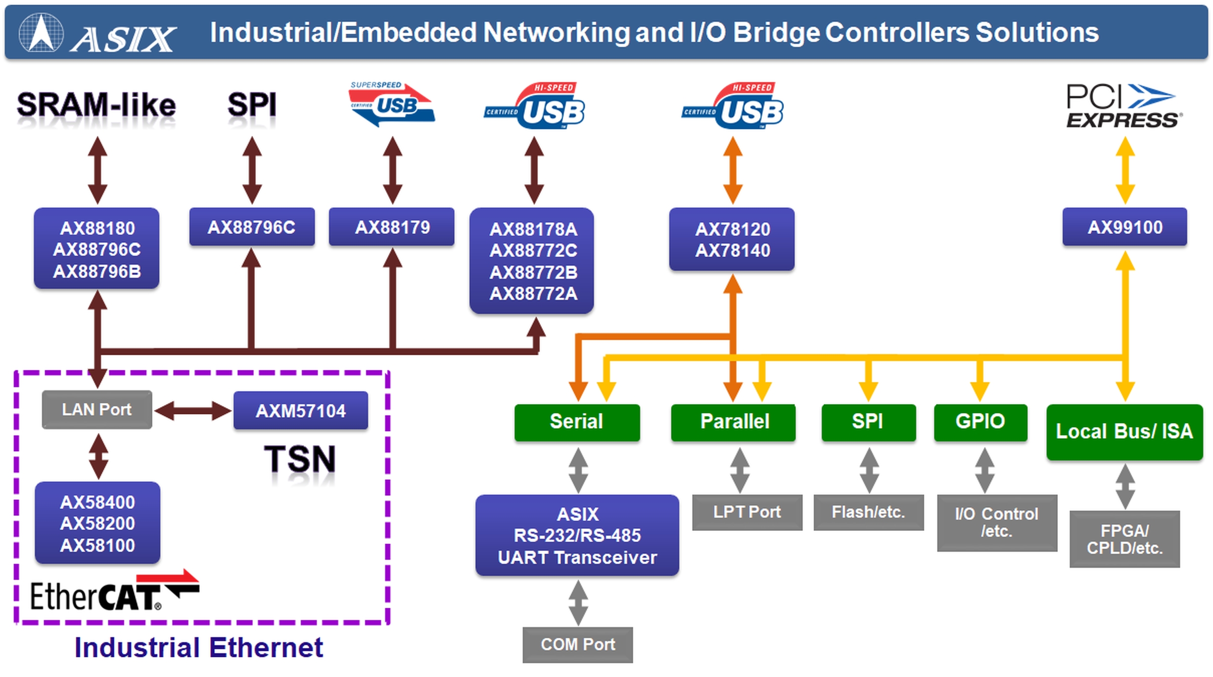 亚信电子提供两个PCIe/USB转串并口I/O桥接芯片解决方案: AX99100 PCIe串并口I/O桥接控制器和AX78140/AX78120 USB串并口桥接控制器。这些方案可适用于各种工业计算机与I/O接口连接器等产品相关应用。 AX99100 PCIe串并口I/O桥接控制器,除了可以支持PCIe转串并口(4串/2串1并)的典型应用外,另外可支持PCIe转SPI、GPIO、Local Bus(ISA)I/O接口桥接功能,可适用于PCIe资料搜集与通信卡、PCIe影像撷取卡、PCIe转CAN通信接口等相关产品应用。 AX78140/AX78120 USB串并口桥接控制器,可以支持USB转串并口(4串/2串1并/2串/1串)等产品应用。亚信同时提供RS-232/RS-485 UART收发器,可以搭配PCIe/USB转串口桥接控制器一起做产品设计开发。