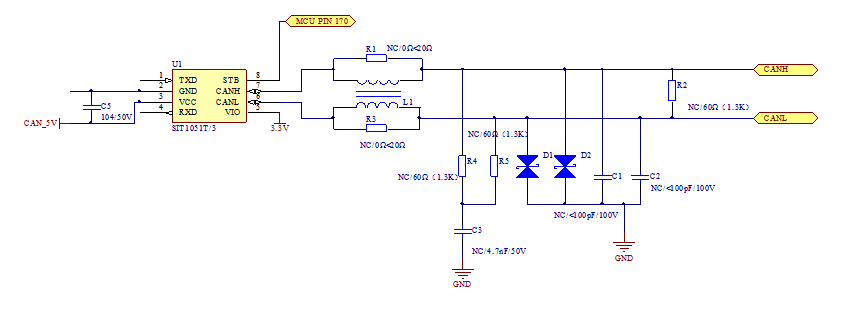 CANH 和 CANL 输出到 GND 的一对匹配电容用于提高抗电磁干扰的性能。相应噪声源的阻抗和 CANH 和 CANL 对地的电容组成了一个 RC 低通滤波器。电容值必须由节点的数量和数据传输频率决定。一般选取《100pF,如果外接 ESD 保护器件,该电容值可适当减小或省掉。图中串联电阻可调整与对地电容形成的低通滤波器性能,但电阻值不应过大,导致显性差分电压值降低明显。