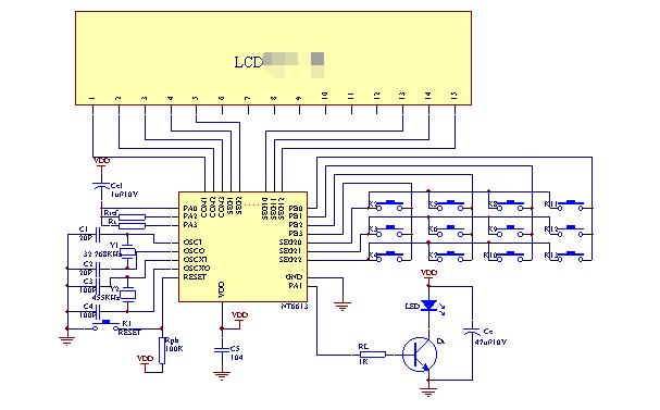 空调遥控器系统可分为控制器(SH6613),液晶模块,键盘,测温电路和红外发射电路几个部分组成,应用电路图如图2。