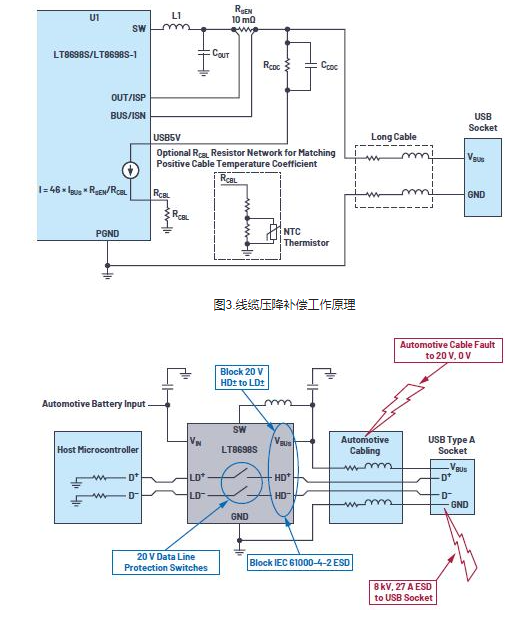 当USB插座与控制器的物理距离较远时,例如USB插座位于车辆后部,而USB主机位于仪表板中,那么线缆压降补偿可使VBUS轨保持精确的5 V稳压状态。LT8698S具有可编程线缆压降补偿功能,可在USB插座上执行出色的调节,而无需额外的开尔文检测线路。