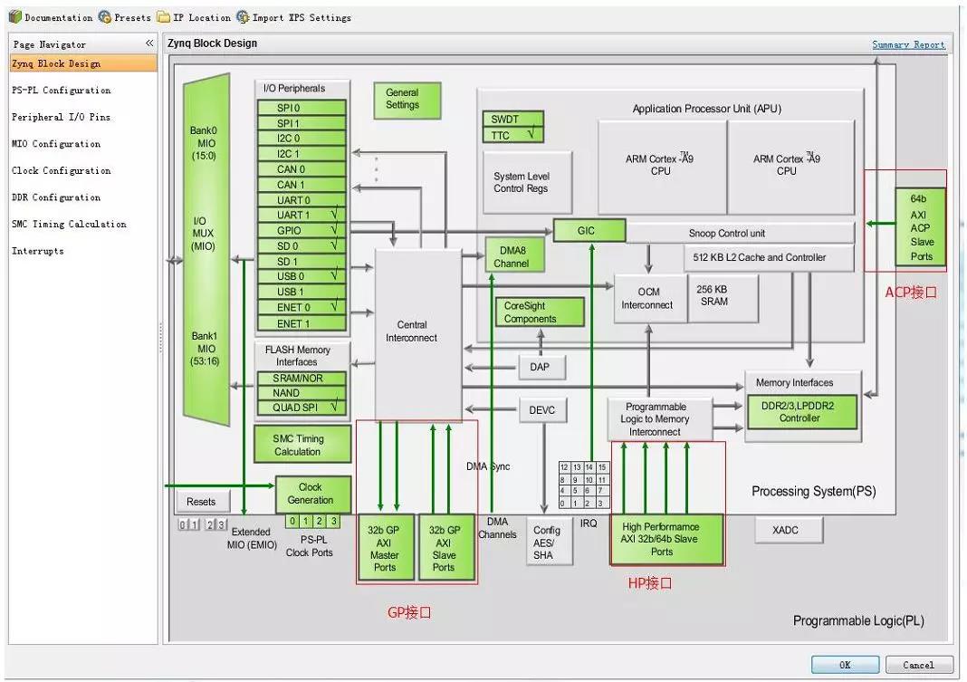 (C)AXI-ACP接口(1个):是ARM多核架构下定义的一种接口,中文翻译为加速器一致性端口,用来管理DMA之类的不带缓存的AXI外设,PS端是Slave接口。