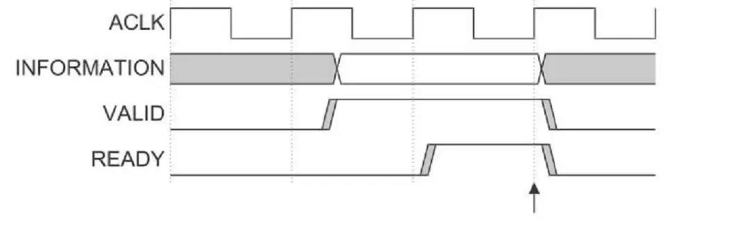 而目地源产生READY信号来指明已经准备好接受数据或控制信息。 传输发生在VALID和 READY信号同时为高的时候。