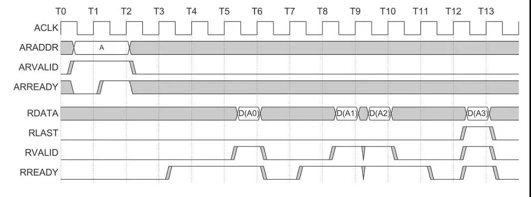 当地址出现在地址总线后,传输的数据将出现在读数据通道上。设备保持VALID 为低直到读数据有效。为了表明一次突发式读写的完成,设备用 RLAST 信号来表示最后一个被传输的数据。