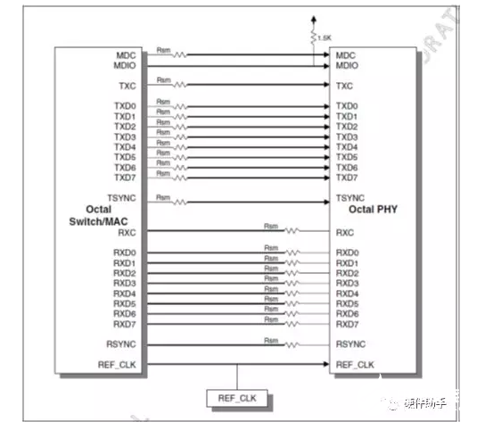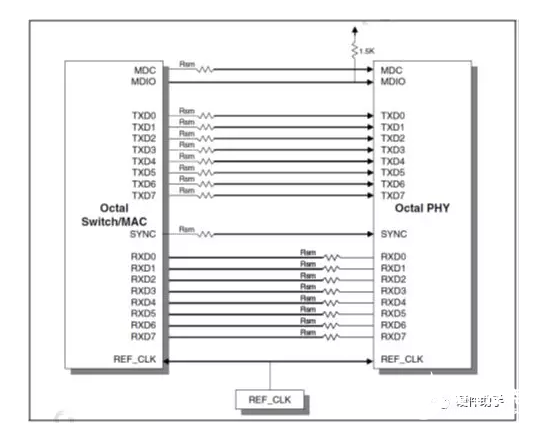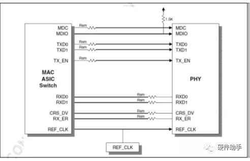REF_CLK:所有端口共用的一个参考时钟,频率为125MHz,为什么100Mbps速率要用125MHz时钟呢?因为在每8位数据中会插入2位控制信号。