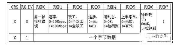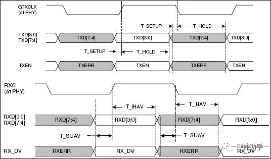 TX_EN信号线上传送TX_EN和TX_ER两种信息,在TX_CLK的上升沿发送TX_EN,下降沿发送TX_ER;同样的,RX_DV信号线上也传送RX_DV和RX_ER两种信息,在RX_CLK的上升沿发送RX_DV,下降沿发送RX_ER。