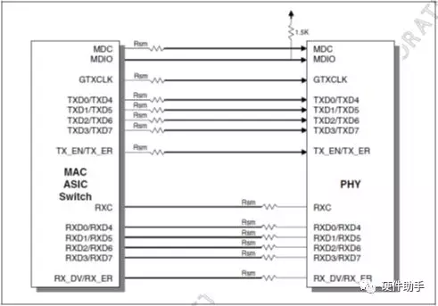 在实际应用中,绝大多数GMII接口都是兼容MII接口的,一般的GMII接口都有两个发送参考时钟:TX_CLK和GTX_CLK(两者的方向是不一样的),在用作MII模式时,使用TX_CLK和8根数据线中的4根。