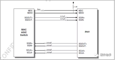 SGMII收发各一对差分信号线,时钟频率625MHz,在时钟信号的上升沿和下降沿均采样,参考时钟RX_CLK由PHY提供,是可选的,主要用于MAC侧没有时钟的情况,一般情况下,RX_CLK不使用。收发都可以从数据中恢复出时钟。